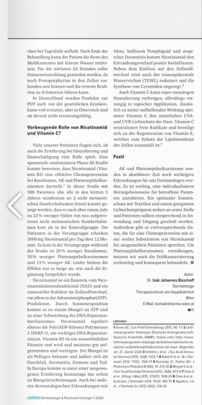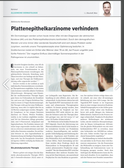 Aktinische Keratosen und daraus folgende Plattenepithelkarzinome werden bei einer alternde Bevölkerung zur Volkskrankheit. Neben einem guten Sonnenschutz gibt es auch andere Maßnahmen in der Prävention und Therapie, die man ergreifen kann. Lesen Sie gerne mehr in meinem Artikel in der Fachzeitschrift JATROS Dermatologie & Plastische Chirurgie.