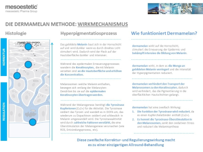 Dermamelan wird als weltweit führende Depigmentierungsbehandlung angesehen. Sie beinhaltet ein Gesamtkonzept, um langfristig die Pigmentierung zu normalisieren. Die Behandlung wirkt sich auf den gesamten Melaninprozess aus und verfolgt eine Zweifachwirkung: einerseits die Korrektur, andererseits die langfristige gewährleistung des Therapieerfolgs. Vor allem bei komplizierten postinflamatorischen Hyperpigmentierungen und Melasma werden sehr gute Erfolge erzielt. Diese Methode wird auch bei dunklen Hauttypen bedenkenlos eingesetzt.