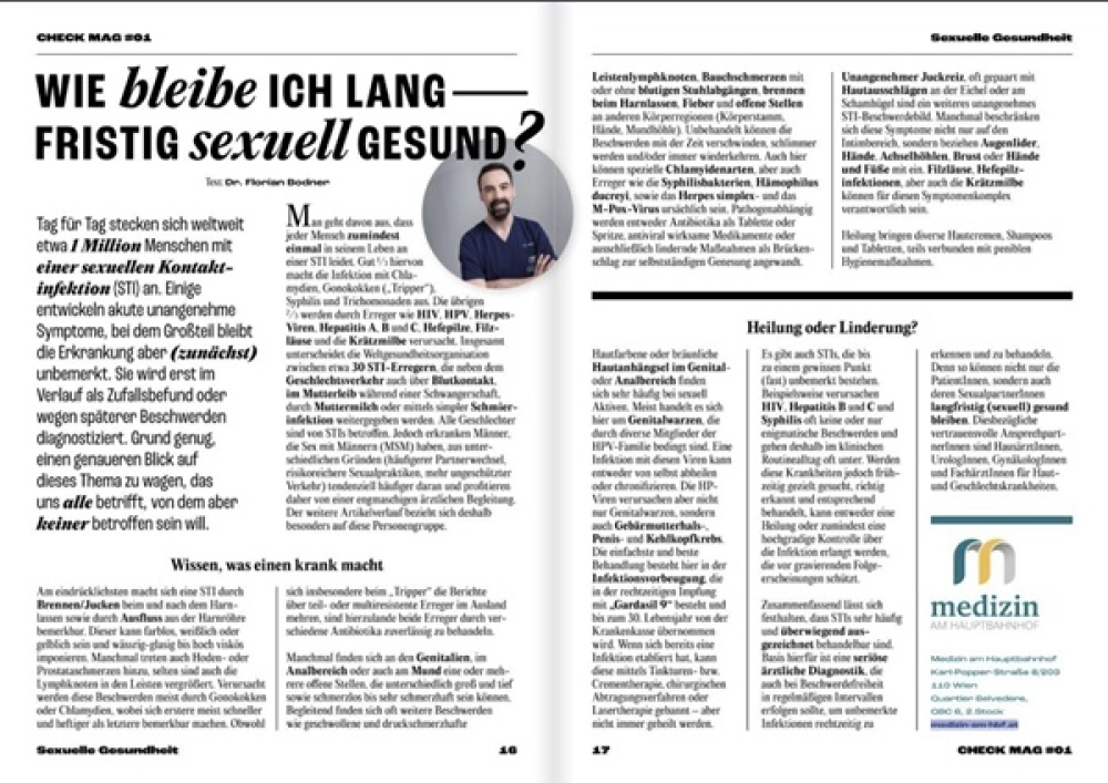 In May, the first issue of the men’s health magazine CHECK was published in Austria. For this magazine, Dr. Florian Bodner wrote an article on the topic "How to Stay Sexually Healthy in the Long Term." You can also find information on sexually transmitted diseases (STDs) on our website.
