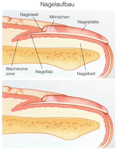 Die Nägel zählen zu den Anhangsgebilden der Haut und bestehen aus dichten verhornten Zellresten. Die Nägel bestehen aus vier Teilen
